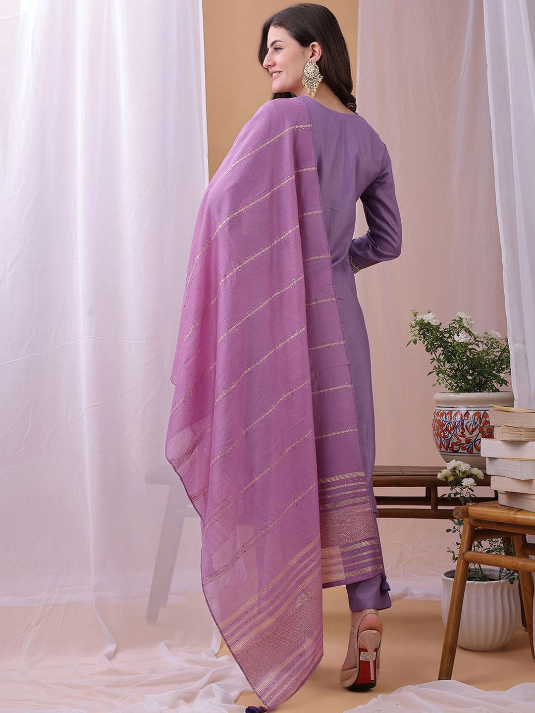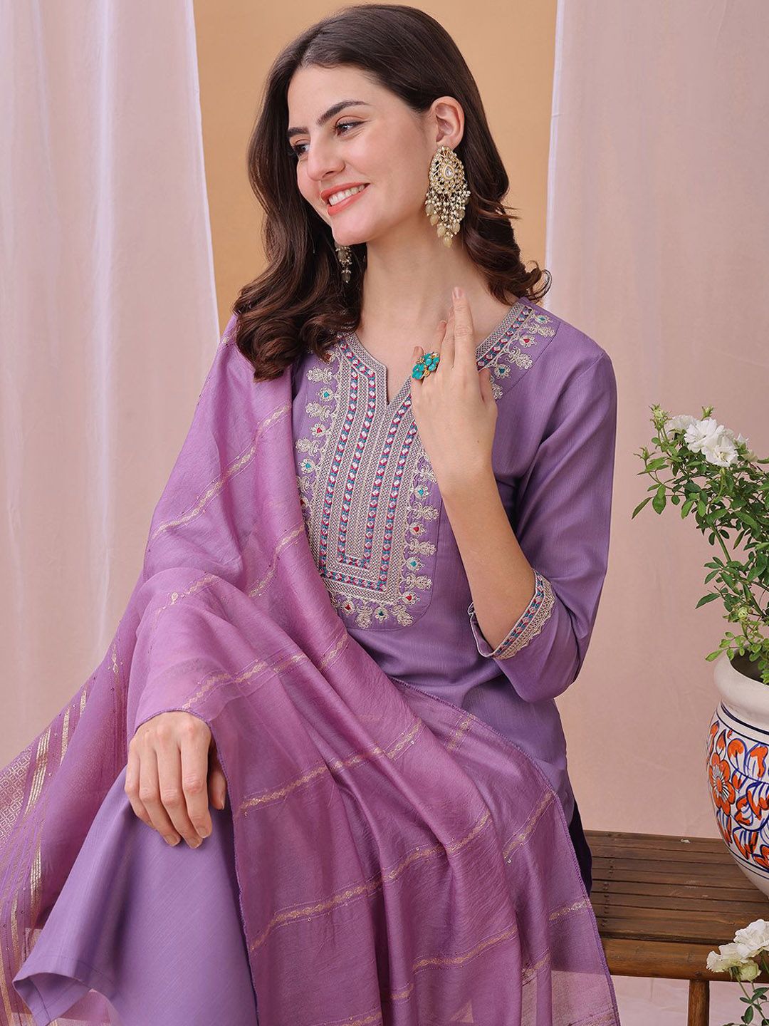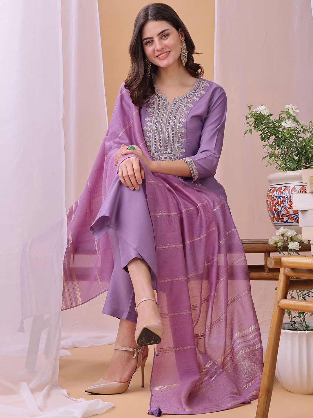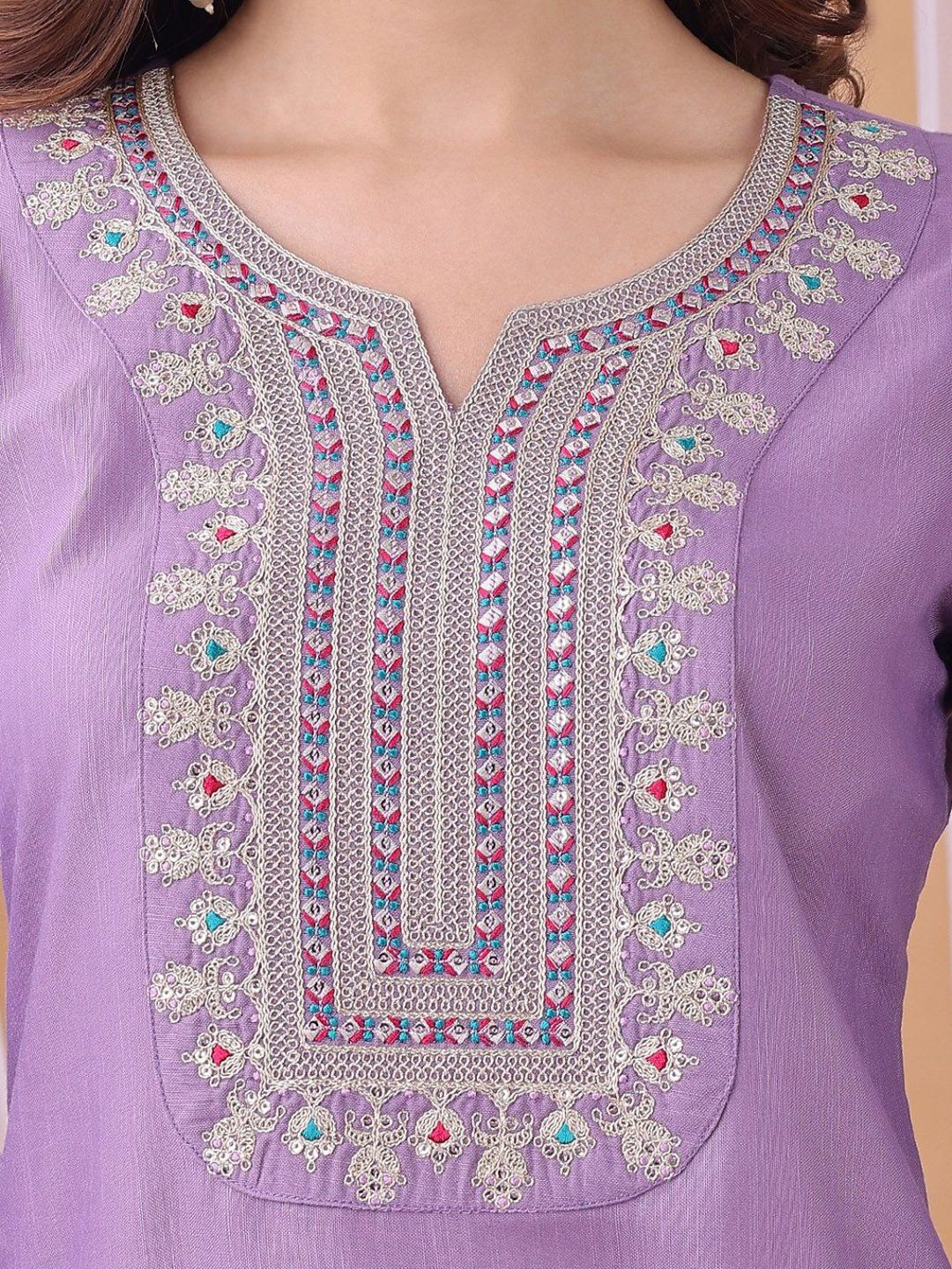 KALINI presents this elegant Lavender Kurta Sets crafted for Women. Made using premium Not Available, this outfit features a refined Not Available silhouette, a stylish Round Neck neckline and Three-Quarter Sleeves. The Not Available hemline and Not Available length complete the look. Perfect for Festive wear.